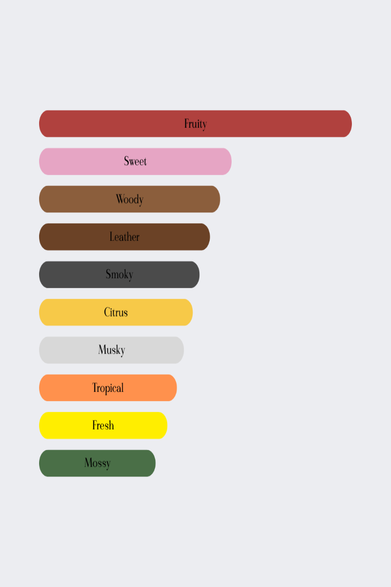 Fruity, Sweet, Woody, Leather, Smoky, Citrus, Musky, Tropical, Fresh, Mossy
