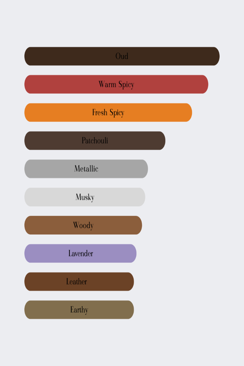 Oud, Warm Spicy, Fresh Spicy, Patchouli, Metallic, Musky, Woody, Lavender, Leather, Earthy